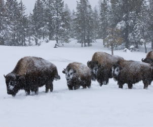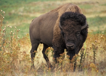 ![]() ![]() Bison are easy to identify. A noticeable characteristic is the hump on their shoulders. Another is their deep brown fur, which can grow very long. Bison also grow a long beard and mane. The head is very large, with a thick skull. Bison fight by crashing their heads or horns together. Both male and female bison have short, curved, black horns, which can grow to half a metre long. The American bison was called "bufello" by early American settlers due to some similarities between it and known buffalo species. The words "bison" and "buffalo" are often used interchangeably, but the bison and the buffalo are completely different animals. The American bison (Bison bison) and the two main species of buffalo live on different continents. The African or cape buffalo (Syncerus caffer) and the wild Asian water buffalo (Babalus arnee) are only distant relatives of the American bison. Bison once ranged over much of North America, including central Canada and most of the interior United States. It's estimated that as many as 100 million bison roamed the Great Plains before 1800. Many were slaughtered by the U.S. government in an organized effort to destroy the livelihood of Plains Indians. By the 1980s, fewer than 1,000 remained. ![]() (There are two bison subspecies, the plains bison and the wood bison; 20,000 are plains bison and 10,000 wood bison). Another approximately 500,000 individuals are managed commercially as livestock. Today bison are only wild in national parks, state parks, and reserves. American bison like open plains, savannas, and grasslands. American bison are herbivores. They like low growing grasses and sedges, and are constantly on the move, traveling in groups, and even walking while they eat. Herds are usually divided by sex, with females and calves in one herd and males in another. When the summer breeding season begins, males may join the female herd looking for a mate. The dominant bulls (male bison) choose a female and defend her against other males. The males butt heads or use their horns. Once the female agrees to mate, the pair mates several times. ![]() The cows will care for their young for about a year. Before they're a year old, juvenile bison are feeding on their own and have the brown fur of the adults. ![]() Despite their immense size, bison still have to worry about predators. Buffalo calves can easily become the prey of a wolf pack or grizzly bear. ![]() ![]() |