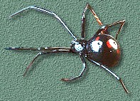 The Black Widow Spider is the common name for several related long-legged, smooth-bodied spiders that live in areas ranging from the Tropics, most of the United States, and as far north as Canada. The shiny black body and red hourglass shape on its abdomen are easily recognizable characteristics of the Black Widow female; the smaller males are a dull brown, and harmless. Black Widow females spin irregular webs in crevices and other dark, protected spots, especially in wood piles, under the eaves of