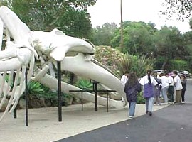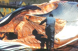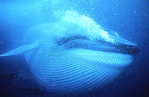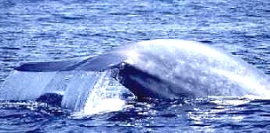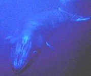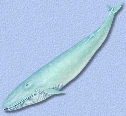 Balaenoptera musculus Blue whales are the largest animals to have ever existed .... larger even than the biggest dinosaur. Some have been as long as 33 metres (110 feet), but most are in the 24-27 metre range. Blue whales can weigh up to 110 tonnes (120 tons). They have a life expectancy of 35-40 years. Blue whales are bluish-grey in colour, and their underside is slightly lighter. Blue whales feed on tiny organisms called krill. Krill are tiny shrimp that live in large schools in almost every ocean of the world. They are one of the most plentiful food species (except for insects) on earth. The baleen in the whale's throat filters out krill by the thousands. Small fish and plankton are also caught by the baleen. It may take as much as 3500 kg of krill and small fish a day to keep the Blue whale healthy. ![]() Blue whales are fast swimmers, able to reach speeds of 30 km/h if chased. Whales are mammals, and must surface to breathe, but they can hold their breath a long time ... dives can last anywhere up to 20 minutes. Blue whales also make very loud sounds. The low-frequency sounds they make when they communicate with each other have been recorded as loud as 188 decibels, and can be heard as far as 800 km away. (For comparison, a commercial jet taking off makes a sound of 120 db). Learn more about sound, and hear a blue whale here. The buoyant force of water in the whale's ocean environment is one reason that it can grow so large. Instead of relying on just a skeleton to support its weight, the buoyancy of the surrounding ocean water supports the whale's body tissues. If a Blue whale were to be removed from the ocean, it would be crushed to death by its own weight. Packs of Killer whales have been known to attack and kill young Blue whales, but the Blue whale's main predator has been man. Blue whales were hunted nearly to extinction, until the International Whaling Commission declared them to be a protected species in 1966, because of the huge decrease in their population. Blue whales comprised about 90 percent of the whaling industry’s total catch during the early part of the twentieth century; in 1931, more than 30,000 were killed, for their blubber, flesh, bones, and body oils . Today it is believed that about 11,000 still exist.