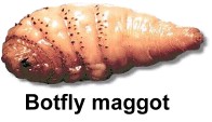 The botfly that uses humans as hosts may be the nastiest little creature you've ever come across! 'Botfly' is the common name for several types of hairy flies whose larvae live as parasites within the bodies of mammals. There are types of botfly that target horses, sheep, cattle, deer and other mammals. But the one that's most unpleasant is the one that uses humans for a food source for its larvae. We'll tell you all about it below. We hope you have a strong stomach! A species of botfly (found only in Central and South America) captures a mosquito and lays its eggs on it ... about 30 of them. The botfly then releases the mosquito. Eventually the mosquito lands on a person. The warmth causes the eggs to hatch, and the larvae (or maggots) fasten to the person's skin. The larvae now eat their way into the skin of the person, and begin feeding on muscle tissue. Tiny hooks hold them in place. A hole is left in the skin so the larvae can breathe. A boil-like lesion develops at the site of infestation. After about 6 weeks the larvae have grown fat while dining on your flesh; they eat their way out and drop to the ground, where they pupate. Adult botflies emerge from the pupas in about 20 days, and the cycle starts all over again. People who have had a botfly larvae infestation in their flesh report that they could feel the maggots moving under their skin. Removing the maggots is difficult, as they are hooked to the flesh. Sometimes they can be squeezed out, but often surgery is necessary. Doctors actually advise that victims not try to remove the larvae on their own, as the larvae may burst, leaving maggot parts inside your skin that could lead to infection. Usually the wound heals quickly, with no side-effects other than a small scar. Occasionally there may be infection. However, if the site where the maggots are is easily damaged, quick removal is necessary to prevent other complications. Below left, a botfly maggot is exiting a person's chest. The picture in the centre below shows a botfly maggot being removed from someone's eye, where it had been feeding and growing. At the right below, maggots that get into the brain can cause meningitis and death. ![]() ![]() ![]() |