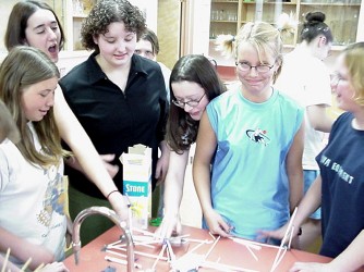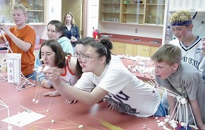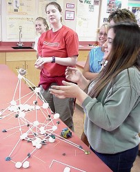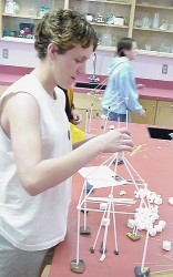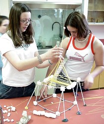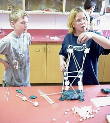 ![]() Science 7 & 8 classes tried building bridges and towers from spaghetti, straws, plasticene, and marshmallows. Here are a few of their designs. Some were more successful than others. The class discovered that soft marshmallows don't work well with large structures ... the straws weren't held firmly enough to prevent sideways motion. Similarly, long pieces of spaghetti tended to flex too much. Only the best designs using marshmallows or spaghetti avoided tipping. Plasticene worked well as a connector, and provided good lateral (shear) strength Some structures disintegrated in spectacular fashion.