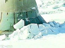 At the left, the ice shield protecting the footings. Moving ice is pushed up, and cracks.
