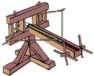 Defenders also threw rocks with catapults, and dropped rocks on attackers who were attempting to scale the walls. They used crossbows, and the majority of the defending soldiers carried swords, or were longbow archers. Another important weapon was the ballista. This was a gigantic crossbow, which fired huge arrows with great force. Using twisted ropes for storing energy, its arrows could penetrate several feet of wood, or several men. Its chief use was for disabling the catapults and trebuchets of the attackers.