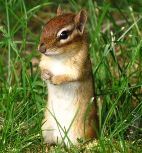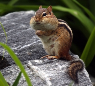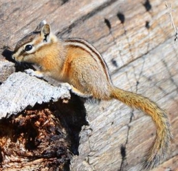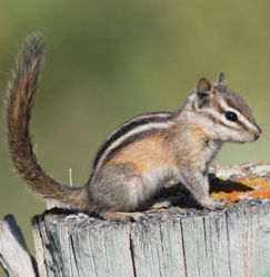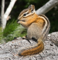 ![]() ![]() Chipmunks are fun to watch. With their boldness in search of food and their quick movements, they are not hard to approach or photograph. There are four species of chipmunk in Canada; we'll look at the three that can be found in Alberta. ![]() Range: Alberta, British Columbia, Manitoba, Northwest Territories, Ontario, Québec, Saskatchewan, Yukon Least Chipmunks are the smallest of all chipmunks. They have five dark and four light stripes along their sides and three dark and two light stripes on the face. Their fur is orange-brown, and their underside is greyish-white. Their tail is bushy, long, and pale brown. ![]() Range: Alberta, British Columbia Yellow-pine Chipmunks are small compared to other chipmunks. They have five black stripes down the back; three dorsal stripes extending from shoulder to rump and two lateral strips extending to mid-body. The pale stripes are usually white or greyish. Their fur varies from tawny to pinkish-brown and their ears are whitish behind and black in front. ![]() Range: Alberta, British Columbia The Red-tailed Chipmunk is darker and larger than most chipmunks. It is often reddish-brown on the shoulders and sides. The back is orange-brown, the rump is grey and the underside is whitish. The tail has a black stripe. Red-tailed Chipmunks have five dark stripes, the central one running from between the ears to the tail. Its four pale stripes are greyish to white and it has two pale stripes and three brown stripes on its face. Chipmunks are rodents, and belong to the Squirrel family. All species of chipmunks in Canada live in forested areas. Most live in burrows and gather food on the ground, usually in areas where there are enough rocks, bushes, fallen logs, and piles of brush to shelter them from predators as they scamper about. Chipmunks are solitary animals; each chipmunk has its own burrow and ignores others except when conflicts arise, or during mating. ![]() Also, chipmunks frequently call with a high-pitched chirp or chuck, repeated over and over at intervals of one or two seconds. This loud scolding noise is often made by a chipmunk watching an intruder, often you, from a safe vantage point. Most chipmunks construct tunnels or holes in the ground. Entrances are well hidden under rocks or bushes. Some western species spend a fair amount of time in trees and may even nest in tree cavities. They need about 15 hours of sleep per day. Chipmunks are known to be hibernators; near the end of July they begin to collect and store large quantities of seeds. By October, each chipmunk has accumulated enough seeds to enable it to survive the winter. It is not known exactly what happens with chipmunk hibernation during the winter. One theory is that they immediately go into a torpid state, where their body temperature, rate of breathing, and rate of heartbeat drop to very low levels, reducing the amount of energy they require. Periods of torpor may last from one to eight days; between periods of torpor, chipmunks wake up and consume part of their food supply. They have occasionally been seen above ground on warm winter days. A second theory is that chipmunks do not actually hibernate until their food supply has been exhausted. In any case, they will emerge from hibernation during the first warm days in March, sometimes burrowing up through a metre of snow. A chipmunk spends much of its day collecting and storing seeds, which are its most important source of food. Although most species of chipmunks usually forage on the ground, they all easily climb trees and shrubs to harvest nuts and fruit. In Canada, in most years, chipmunks have only one breeding season and one litter, but in favourable years a small percentage of adult eastern chipmunks produces a second litter in the fall. No species of chipmunk is found north of the treeline or in prairie grasslands in Canada. ![]() When collecting seeds, the chipmunk holds them in its dexterous front paws, and with sharp cutting teeth, removes the seeds from their pods. Then it uses its tongue to stuff them into the expandable skin in the cheek area, where they are held while the animal collects more food. When the cheek pouches become full, the chipmunk deposits the seeds in its nest, or buries them in shallow holes that it covers with earth, leaves, and other litter. In spring, chipmunks will look for any seeds that remain from the previous summer. They will also eat young leaves until new fruit and seeds become available. During spring, summer, and autumn, their diet can also include insects, earthworms, flowers, berries, cherry and plum pits, mushrooms, and occasionally eggs or flesh of dead animals. Chipmunks have many predators, including hawks, weasels, coyotes, martens, foxes, and snakes. Near populated areas they can also be killed by dogs or cats, or by automobiles. Males fight among themselves when competing for females, and females have been observed defending their nests and young against other chipmunks. Chipmunks are important in the dispersal of seeds because of their habit of storing them under vegetation on the forest floor. Any buried seeds that are not consumed will likely germinate, spreading the growth of shrubs, trees, and other plants. |