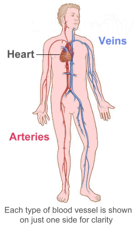 ![]() ![]() This system delivers both oxygen from the lungs and nutrients, using the blood, which travels to all cells in the body through a network of arteries. The arteries eventually end up at very tiny blood vessels called capillaries. The capillaries have very thin walls where the blood flows more slowly. Through them, in the small intestine, the blood gathers food nutrients which will get delivered to every cell. Waste products are also brought into the capillaries from various organs. After these transfers through the very thin capillaries, these vessels lead back to larger and larger veins as the deoxygenated blood returns to the lungs for exhalation, where the carbon dioxide is dumped and oxygen absorbed. The blood also travels to the organs that remove wastes from the blood and eliminate them from the body. For example, excess water is filtered out by the kidneys, and toxins are removed from the blood by the liver. The heart pumps blood around the body. It sits inside the chest, in front of the lungs and slightly to the left side. The heart is actually a double pump made up of four chambers, with the flow of blood going in one direction due to the presence of the heart valves. The contractions of the chambers make the sound of heartbeats. On the right side of the heart is an upper chamber called the atrium that takes in deoxygenated blood that is loaded with carbon dioxide. The blood is squeezed down into the right lower chamber, the ventricle, and is then pumped through the pulmonary artery to the lungs where the carbon dioxide is replaced with oxygen.You can see an animation of this process on our heart page. The heart sounds include the movement of blood in and out of the four chambers. We hear the sounds of the valves between chambers opening and closing in synchronization between left and right. It isn't actually the sound of the valves closing which we can hear; the noise is created as the closure of the valves causes a vibration in the heart walls which travels through surrounding tissues until it reaches the chest wall, where it can be heard with a stethoscope. It makes a lub - dub' sound. The blood vessels have a range of different sizes, depending on their role.