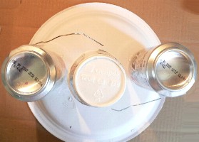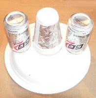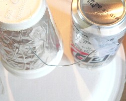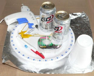 ![]() ![]() You'll need a paper plate, two pop cans, a styrofoam cup, two paperclips, some wire, a cheap ball point pen, aluminum foil, tape, and some glue. You'll also need some scissors, and some sort of pliers that can cut a pointed end on a paperclip We used wire test leads with alligator clips at the ends to make attachments more quickly, but if you don't have any of these, you can attach the wires with tape. Don't use contact cement; we discovered too late that it dissolves styrofoam, and had to start over! Instead we used a hot-glue gun and plain white glue. ![]() ![]() Cut them and attach them so that two half-inch gaps are left on opposite sides of the cup, as shown at the right. Smooth them out to flatten the wrinkles, and make sure the edges of the foil are glued down flat. You might also want to trim the uncovered styrofoam rim below the foil, to make the cup lighter; we didn't do that. ![]() ![]() Attach the flat side of the plug, using hot glue, to the exact centre of the inside bottom of the cup. Make sure it really is centred exactly, and sitting flat on the bottom. Place the metal end of the pen into this little plug, balancing the cup upside down on the pen, and spin it to make sure the plug is centred and that the cup spins easily. ![]() ![]() Glue the end of the pen to the centre of the back of the paper plate, using hot glue, as shown in the photo at the left. Place the cup upside down on the pen, making sure the tip fits into the plug. Then glue the two pop cans upside down onto either side of the cup, leaving half an inch or so of space between the cans and the cup, so the cup can spin without touching them. Now prepare the paperclips. Do the following to each paperclip: straighten two of the bends, leaving one bend at the end. Twist the paperclip into an 'S' shape. Now take one of the paper clips and tape the bent end onto the right can, as shown in the photo below left. Make sure the sharpened straight end is pointed directly at the foil on the cup, about a half inch away; the pointed end should be the closest part of the paperclip to the cup. Next, do the same thing to the other paperclip, on the left can. When you're done, the set-up should look like the photo at the right below. ![]() ![]() ![]() Place the apparatus near an older television, and spread the foil across the screen. Hold the left wire in your hand ... your body will be the ground. Give the cup a slight turn if necessary, so that the pointed ends of the wire are next to the foil rather than the gaps between. Now turn the TV on. The cup should begin to turn. As it slows down, turn the TV off. This will cause the cup to turn some more. Continue turning the TV on and off to make the cup motor keep turning. ![]() The right can and the paperclip attached to it get charged up with electrons from the TV screen. These excess electrons on the can and paperclip are under pressure to escape, and this pressure is highest at the very tip of the paperclip. The pressure of electrons is so high there that they can jump off into the nearby air! This causes the air near the tip of the paperclip to become negatively charged, and it is then repelled by the still negative paperclip. The negatively charged air moves away from the paperclip and towards the nearest piece of foil, which they jump on to. Now this foil is negatively charged, along with the right can, and they repel each other. The foil, being attached to the cup, can rotate away from the can, and it does. But there's more. The negatively charged foil repels the electrons in the left can, leaving behind a positive charge on the left can, which now can attract the foil. So this also helps to rotate the cup. After the cup has revolved half way, the excess electrons can escape in a similar fashion - through the air onto the left can, and out through the ground. This leaves the original piece of foil neutral and ready to begin the cycle over again. Meanwhile, the other piece of foil is going through the whole process too. |