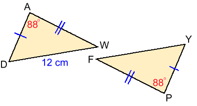 ![]() Page Three Practice Fill in your answer(s) in the box(es) provided. When you're all done, check your answer by holding your mouse cursor over the grey square below each diagram. ![]() 1. Are these triangles congruent? Why of why not? ![]() ![]() 2. Why are these triangles congruent? How long is side YF? ![]() ![]() 3. Sometimes the problem has information missing that you have to provide yourself, based on geometry facts you have learned. There are some equal angles in the diagram. Check here if you don't know which ones. Then come back. These are triangles ![]() Here is the diagram with the equal angles filled in. Why are the triangles congruent? ![]() See why here ![]() 4. Prove that Δ ABC ≅ Δ CDA We have to prove the triangles are congruent using one of the shortcuts. Let's start by finding some equal things. Review parallel lines first; then come back. The parallel lines AB and CD mean that alternate angles ∠BAC and ∠DCA are equal ('Z' pattern) The line AC is common to both triangles, so this side is equal in both triangles. What shortcut proves the triangles are congruent? ![]() See the solution here. |