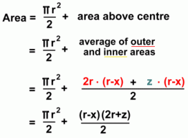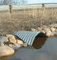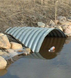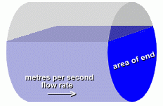 ![]() ![]() We are able to make some simple measurements at the culvert: - distance to the surface of water, from the top of culvert - radius of the culvert - length of the culvert - width of the water surface in the culvert In addition, we can fairly easily work out the rate of flow, in metres per second. With all of this data, we'll show you how to make an estimate of the volume of water flowing through the culvert in cubic metres per second. ![]() There is a standard formula for calculating the rate of quantity flow for a stream, pipe, or culvert: Quantity (m3/s) = water velocity (m/s) x cross-sectional area of water (m2) We'll need to know how fast the water is moving, and the cross-sectional area of water in the culvert. (For simplicity, it will be assumed a perfect cylinder) Velocity of the Water: We don't have a device for measuring this, but it is fairly easy to calculate. We'll drop something in the water at one end of the culvert, and time how long it takes to reach the other end. Kenneth is going to help us with these measurements. ![]() ![]() ![]() The length of the culvert is 20 metres. The object dropped into the water took about 100 seconds to travel this distance. This makes the velocity of the water approximately 20 m in 100s, or 0.2 m/s Area of the Water in the Culvert ![]() So instead we'll make an approximation of this area, the area shown in the diagram in blue, at the right, which represents the area of the water in the pipe for a culvert more than half full. This calculation is shown below. ![]() ![]() The difficulty lies in calculating the area of the light blue segment, which has curved ends. The formula for this area is too complicated to make use of here. Instead, we'll find the area of the outer and inner rectangles surrounding this segment, and average the two. The answer will be quite close to the actual area of the segment. Let's do the calculations with variables first, to obtain a formula. Then we'll use the actual measurements from the water in the culvert to calculate its area. ![]() ![]() x is the distance from the top of the culvert, down to the surface of the water. r-x is the difference between the radius and the number above (or the water's height above the cylinder's centre) z is the width of the surface of the water in the culvert. The dimensions of both the outer and inner rectangles are shown at the right. We want to average them. ![]() At the right is the calculation showing the total cross-sectional area of the water in the culvert, including both the half-circle below, and the approximation for the area above centre. The half-circle below centre has the area formula A = (pi · r2)/2 Both the outer and inner rectangles have the area formula A = L x W We are adding these two areas, and dividing by two to average them. In the last step, we factored out the (r-x) to make the final formula a little simpler to work with. Now let's use it with the actual culvert measurements ... ![]() ![]() At the right is the formula with the actual values filled in; this gives us the total cross-sectional area of the water in the culvert. Although this value is an approximation, it is certainly close enough for our purposes. Area of water in pipe = 2.34 m2 ![]() Now let's go back to the formula for calculating the rate of quantity flow for a pipe: Quantity (m3/s) = water velocity (m/s) x cross-sectional water area (m2) Q = V · A = 0.2 m/s x 2.34 m2 = 0.47 m3/s or about half a cubic metre, per second. 0.5 m3 per second corresponds to 30 m3 per minute, or 1800 m3 per hour. This is equivalent to about 63,500 cubic feet per hour, or about 1,060 cubic feet per minute, or approximately 6600 gallons per minute. Here are some conversion factors you might find useful: