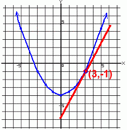 The slope of the curve at (3, -1) is exactly the same as the slope of the line at that point. This line touches the curve only at (3, -1) and nowhere else; it is the tangent to the curve there.