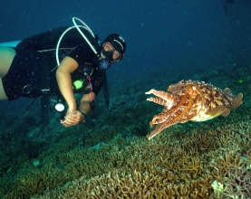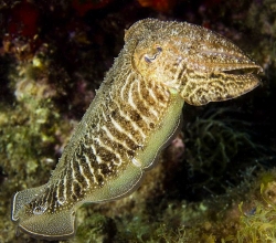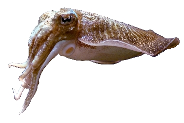 ![]() ![]() ![]() Their home is in the shallow reefs of the southern waters of Australia. These cuttlefish can weigh as much as 10 kg and be up to a metre long, although most are not that big. They have 8 arms and two feeding tentacles. The tentacles normally are retracted into sockets above the arms, beside each eye, but can shoot out almost instantaneously to capture its prey, which include fishes, crabs and other crustaceans. The Giant Australian Cuttlefish isn't a fish at all, but a mollusc, although unlike most molluscs, it has no shell, just a remnant called a cuttlebone inside their mantle, the main body cavity that contains their internal organs, like a squid. Interestingly, cuttlebones are used in birdcages as a calcium-rich dietary supplement for birds. ![]() When muscles contract, these sacs widen and the colour is exposed. Chromatophores produce colours such as orange, yellow, red, brown, and black. Patches of these little cells are connected by nerves that can change in a split second. These cuttlefish have more chromatophores per square centimetre of their skin than any squid or octopus. Underneath the chromatophores lies another thin layer of colour-changing cells called iridophores, which reflect light at different wavelengths resulting in blues, greens, silvers, and pinks. Lecuophores are also light-reflecting cells, but these scatter light so that it appears white. This can provide the cuttlefish with a blank backdrop, helping to increase the intensity of its chromatophores. ![]() Its flashy colour displays can also be used to communicate with other cuttlefish, especially during mating season. Cuttlefish spend 95% of their time resting. Because of their short lifespan, only about two years, they put all their energy into growing and getting ready for mating. Cuttlefish are semelparous animals, which means they only reproduce once during their lifetime. Similar to the octopus, females lay their lemon-shaped eggs on the underside of rocks. Around 100 to 300 eggs are left with no one to guard or care for them. They hatch 3 to 5 months later. Soon after mating and egg-laying, the adults die. Watch an intriguing video about cuttlefish here. ![]() ![]() |