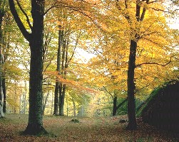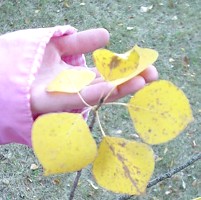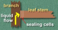 Evergreen trees like pines, spruce, and fir, keep their green needles all year long. But when the cold winds come in late fall, something wonderful happens to the leaves of other trees. On deciduous trees everywhere, the leaves turn amazing shades of yellow, orange, red, and brown, and then they fall to the ground, leaving the branches bare. How does this happen, and why? Let's find out. Wherever there are deciduous trees, like poplar, maple, oak, birch, and elm, all of the leaves will lose their green colour, changing to every possible shade of yellow, orange, brown, and red. Unfortunately, there are very few of these trees in northern Alberta; our range of colours is limited to the yellow hues of the poplar tree, and a small bit of red on the occasional willow. But the change is still spectacular. Almost overnight, trees turn from green to a blaze of yellow. Let's look at how the trees accomplish this amazing transformation, and why. Green plants make their own food. Deciduous trees do this in their leaves, which contain a chemical called chlorophyll. This chemical helps the leaf turn sunlight into food, using a a process called photosynthesis, and it mixes the food with liquids brought up from the soil, and sends it to all the cells in its body. Chlorophyll is a green chemical, which is why leaves look green. In the winter, there isn't much sunlight to make food. But more importantly, any liquid travelling through the thin stems to the leaves, and any liquid in the leaves themselves, would freeze solid in the cold weather. So the leaves aren't needed during the winter months. As it starts to get cold, the tree prepares to get rid of its leaves. Now that the green chlorophyll is gone, you can see the true colours of the leaves, which are actually yellow, gold, and brown. New chemicals also form in some leaves as they die, adding a red, orange or sometimes purple tint. At this point, the leaves are ready to fall. The stem cells between the two layers of sealing cells are dying too, and aren't as strong as they once were ... they can no longer support the weight of the leaf. For a while, the only things still holding the leaf to the tree are the tiny veins through which the liquid used to travel. But these thin strands soon break in the breeze, and the stem snaps off at the spot just between the two layers of sealing cells. The colourful leaves fall to the ground. But soon, most of the chemicals in the leaves that made the colours also begin to disintegrate. The colours fade. Eventually all the leaves are a dull brown, the colour of tannin, which is the only chemical left in the leaves. |