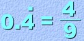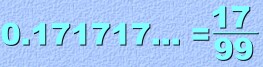 If more than one digit repeats, then the fraction will be over more than one '9'. For example: ![]() In this case, the digits '17' repeat over and over. So the fraction is '17' over two nines. Here are two more like that. Notice again that these are over two nines because two digits repeat: ![]() ![]() And once again, if the fraction you get can be reduced, you must reduce it. Here's a final example with three repeating digits. So of course the fraction will be over three nines: ![]() Here is the rule, summarized one more time: is that number over the same number of nines.' |