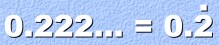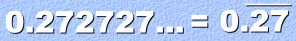 Repeating decimals are not terminating. A repeating decimal continues on forever. One or more of its digits repeats continuously, and the decimal is infinite in length. Here are some examples: ![]() Notice that even though the two's go on forever, you don't have to write all of them. (You couldn't!) There are several simple ways you can write an infinitely long decimal... You can either: - include three of the repeating digits, and then use three dots to show that it goes on forever - include just one repeating digit, and put a dot over that digit We'll be using both methods, so you'll become familiar with them. What happens if more than one digit repeats? Here's an example: ![]() We wrote three repetitions of the '27' before using the three dots. Then, instead of a dot over the repeating digits, we used a bar over the repeating part. Of course, the repeating part can be any length at all. Here's an example with three repeating digits: ![]() To be perfectly correct, we should have included three repetitions of the '145' before using the three dots. But this can get a little tedious if the repeating part is long, so sometimes you just repeat it twice. You must repeat it at least twice, so it is perfectly clear what is repeating. The bar method is a lot less work! It's also possible to have a decimal where part does not repeat, and part does. For example: ![]() Look at this decimal very carefully. Notice that the '2' does not repeat. The '54' does ... and it's the part with the bar over it. Watch out for repeating decimals that are written incorrectly. For example, what decimal is this? 0.135... Does the entire '135' repeat? Or just the '5'? Nobody knows! That decimal was written incorrectly, and is a mistake. It should have been written as: 0.135135..., or perhaps 0.13555..., depending on what the person meant who wrote it. Better yet, write it with a dot over the repaeting digit(s). |