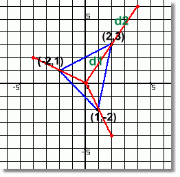 Here is the diagram with the lines drawn through the three corners of the triangle. We've put red dots at the locations that are twice as far from the centre. As an example, look at the top right point of the triangle. The new image point is twice as far away. Distance d2 is the same as distance d1.