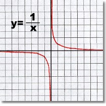 The next example, at the right, is a Rational expression function where there is an undefined value of x. The value of x can never equal zero, since division by zero is not defined. As a result, there is an asymptote at x=0. On either side of this gap the graph approaches infinity.