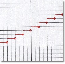 This is probably the first discontinuous function you learned about. It's called a step function, and its domain is still the entire set of Real numbers. (The open circles mean that, for example, at x=2, the y-value is no longer 1, but 2). There are clearly gaps when the function jumps to each new value. You can't run your finger along the graph without lifting it to move to the next portion. This function is discontinuous.