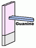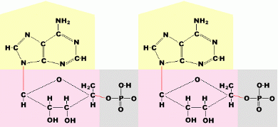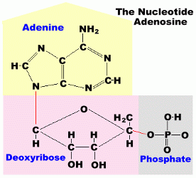 ![]() A nucleotide is a molecule containing three parts: a simple sugar called deoxyribose, a phosphate, and a special molecule called a nitrogen base. A DNA nucleotide can contain any one of four different nitrogen bases. These are adenine, thymine, guanine and cytosine. Nucleotides join together when the phosphate portion on one bonds with the sugar portion on another. ![]() Shown at the left is a very simple nucleic acid with just two nucleotides joined together ... one containing adenine and one containing guanine. Actual nucleic acids contain millions of these nucleotides attached to one another. There are just four possible nitrogen bases that can 'stick out' from a nucleotide. Here are all four of them: ![]() ![]() ![]() ![]() ![]() At the left is a longer nucleic acid shown in simpler form, with the four possible nitrogen bases indicated by letters: A for adenine T for thymine G for guanine C for cytosine Nucleotides can join together in any order, so the sequence of nucleotides can be any pattern like this: C - G - A - C - G - C - C - C - T - A - A - T - C and the pattern can continue for millions of molecules. The origins of the names: - Adenine is from the Greek word for gland, because it was first discovered in the pancreas. - Thymine was first found in the thymus gland. - Cytosine was isolated from cells ('cyto' means cell). - Guanine was originally located in bird guano (poop). ![]() Before we continue, let's look at a single nucleotide in a little more detail. First, at the right is the molecule adenine, one of the four nitrogen bases in a DNA molecule: Adenine isn't a very big molecule, and the other three nitrogen bases are similar in size, differing only in the way the atoms are joined together. When adenine is attached to the simple sugar deoxyribose, which is joined to a phosphate, you get a complete nucleotide, in this case the one containing adenine. It's called adenosine, and there's a diagram of it below, left.