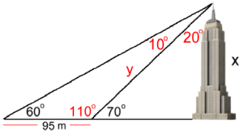 ![]() Page 3 Sin Law Solution: This method is used in Math 20 after you've learned about the Sin Law. ![]() The first step is to use what we know about angles and triangles on a flat surface to fill in all the missing angles. We also label the common side between the left and right triangles 'y'. ![]() This gives us once again an answer of approximately 445 m for the height of the building. |