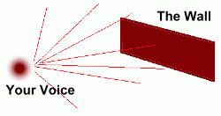 But there has to be more. You can yell all day at a building 75 metres away and not get an echo. What has to happen next is that a lot of the sound coming from you has to be made to bounce back. Notice that the words 'a lot' are underlined. Here's what happens under normal circumstances: The sound leaves your mouth, and travels for a while before it hits something. But sound doesn't travel in a straight 'beam' ... it comes out of your mouth and spreads in all directions. Only a little bit of it actually hits the building you're yelling at: