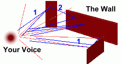 The sound that bounces directly back is now accompanied by more of your voice ... that bounced off other walls back to you (1) ... and more sound that came from the original wall by way of a bounce off a second wall (2). If these other walls are situated just right, a lot more of the sound will arrive back at your ear ... enough to hear the echo even on a normal summer day. The walls inside a big building work especially well (big, because the sound has to travel about 75 metres, remember?) but the building must be mostly empty so there is nothing in the way to absorb the sound. Smooth rock works well, especially in caves, where (because of the enclosed shape) almost all the sound will bounce back. Sides of a valley work too, although too many trees will absorb a lot of the sound.