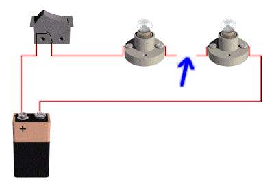 Here is a series circuit with a broken wire. The switch is closed, but neither of the bulbs are lit up. This is because the circuit has been broken. No electricity can flow at all, because there is no complete path from one pole of the battery to the other.