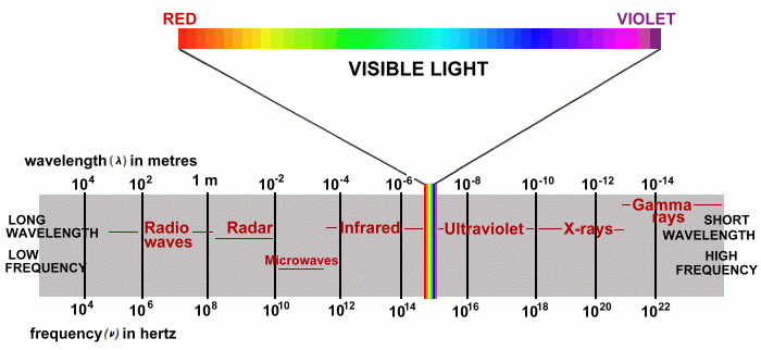 ![]() Visible light can be thought of as a wave, but it's more than that. It's electromagnetic radiation whose wavelength and frequency can vary. Visible light is just one form of this wave ... the part we can see. Visible light is made up of those waves which our eyes can detect; their frequencies range from about 4 x 1014 to 7.5 x 1014 Hz. But this is only a narrow band in the total spectrum of all frequencies of electromagnetic radiation. Below is a chart showing the band of visible radiation as a segment of the entire electromagnetic spectrum. Have a look at the other forms of radiation which are also part of this spectrum: ![]() Radio Waves These waves are extremely long, anywhere from about 1 metre to as big as 10 kilometres (10,000 m) in length. These waves include AM and FM radio signals, and TV broadcasting signals. Radio waves can also be created naturally by lightning, and by atoms releasing energy in space. Much of the static you hear between stations on your radio, for example, is a collection of radio waves released by gases in the atmosphere of planet Jupiter. Here on Earth we generate these waves from antennas and use them to send information by varying their amplitude or frequency. Radar and Microwaves These waves are considerably shorter and have a higher frequency, and so can't be created with a simple antenna; they need a special device to make them called a resonant cavity. Microwaves are about the size of water molecules, so when they hit matter with water in it, they cause the water molecules to gain energy ... this causes the matter the water is in to get hot. Infrared Infrared radiation can't be seen with your eyes, but it can be felt ... it's the heat that radiates off hot objects, like a stove burner or a fire, as the molecules in those objects vibrate. The frequency of these waves (anywhere from 1011 to 1014 Hz) matches the vibration frequency of most molecules, so most matter will gain energy (heat up) when exposed to infrared rays. As their name suggests, these waves are just 'beyond red' on the spectrum. You can not only detect heat with your body, but you can also detect these waves with special camera film or electronic devices. Some snakes have organs that will detect infrared rays; they use them to find their warm-blooded prey. Visible Light These are the electromagnetic waves that eyes are able to detect. All living organisms have evolved eyes that will register the energy from these waves, which are anywhere from 4 x 10-7 to 7.5 x 10-7 m long. In order for an organism's eyes to detect a wave, the cells in the eye must be approximately the same size as the waves. For this reason, no creature can detect long radio waves, for example, because their eyes (and the cells inside) are too small for these huge waves. Similarly, the cells in living tissue are too large to capture tiny gamma rays or x-rays ... although these waves can hit the much tinier atoms within the cells and destroy them. When visible light strikes atoms of matter, the result is often a chemical change; photosynthesis in plants is an example of this. Ultraviolet Ultraviolet waves are just 'beyond violet'. They have more energy than visible light, and so more energy is delivered when they strike atoms of matter. One common reaction occurs in the upper atmosphere, where UV rays hit oxygen molecules and cause them to form ozone. Ultraviolet light is also responsible for breaking chemical bonds in certain cells of your skin, leading to sunburn, wrinkles, and cancer. X-rays X-rays have a much higher frequency and contain a lot more energy than ultraviolet waves. They are more dangerous because they can hit molecules within your body and disrupt them; these damaged molecules can become cancerous. If X-rays happen to hit cells when they are dividing (this happens most frequently in the bone marrow, the skin, and the lining of the intestine), or if you have prolonged exposure to X-rays, this risk increases. Nevertheless X-rays are useful (in small quantities) because they are so energetic; they can penetrate the soft tissues of your body, and photographic images of the more solid parts can be made. Gamma Rays Gamma waves are the most energetic of all. They are emitted by unstable nuclei of radioactive substances, and their high energy makes them very dangerous to living organisms. |