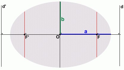 - the two focuses (foci) are on the major axis, and are marked F and F'. They are inside the ellipse. - the two directrixes are lines d and d', perpendicular to the major axis They are outside the ellipse.