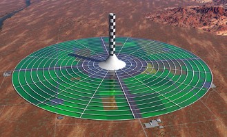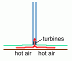 ![]() What exactly is a 'solar tower'? Well, at the bottom is a huge greenhouse-like building, covering many acres, and open at the sides. As in all greenhouses, the air inside gets very hot. It wants to rise ... and it does, through the open tower in the middle. As it passes up the tower, it spins turbines just like in a hydro-electric plant, except it's the wind caused by all that hot air going up that spins the turbine blades. The turbine in turn powers an electrical generator ... and you get free electricity! Because the sides of the greenhouse are open, new air is constantly coming in to get heated and rise up the tower. EnviroMission is a company in Australia that plans to create a much bigger solar tower. This tower, constructed of reinforced high strength concrete, will be 990 metres tall, or almost a kilometre ... more than twice the height of the Petronas Towers, some of the largest buildings in the world. The greenhouse at its base, which will be one of the largest man-made structures, will be circular, with a diameter of 4 km and covering an area on the ground of about 13 square kilometres. The turbines in the tower will generate a huge 200 megawatts. All from hot air rising up the tower! ![]() ![]() Looking sort of like a huge, upside-down golf tee, EnviroMissions's solar greenhouse with its upward-sloping roof, and the tall tower, would provide electricity to as many as 200,000 homes. The airflow inside the greenhouse will reach speeds of up to 50 km/h as it moves up towards the tower, where it will spin 32 wind turbines mounted about 40 m above ground level. The estimated cost to construct the structure will be around $342 million, costing about 70% more per megawatt than a similarly sized wind farm . But once in operation, it is likely to provide a more dependable source of power than wind. Australia is the perfect location for a solar thermal power station. It has the high solar radiation levels required to heat the air, and location isn't a problem, since the plant will be environmentally friendly. Each 200 MW solar thermal power station will help prevent 830,000 tonnes of CO2 gas from entering the atmosphere. EnviroMission’s solar thermal power station will generate electricity 24 hours a day, and will be at its most efficient on hot days, when energy is most needed, and peak prices are paid for electricity. Its design will enable the power station to store heat, and continue to generate energy during the night. This special feature will give it a big advantage over other forms of renewable energy. |