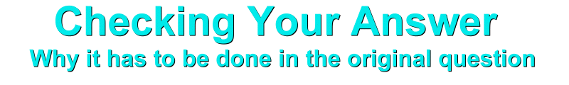 ![]() Suppose you make a mistake when simplifying the first step. Let's look at what could happen. Have a look at this example: 2(3x + 1) + 4 = 11 Let's solve it: 6x + 1 + 4 = 11 You can see that a mistake was made in the very first step. The 2 was multiplied by the 3x, but not the 1. Let's continue to solve. No more mistakes will be made. 6x + 1 + 4 = 11 6x + 5 = 11 6x + 5 - 5 = 11 - 5 6x = 6 x = 1 Now suppose we choose to check this answer in the third line : 6x + 5 = 11 The check would certainly be less work using this line. Here goes: 6x + 5 = 11 6(1) + 5 = 11 6 + 5 = 11 11 = 11 The check worked, so we're satisfied our answer was correct. BUT WAIT A MOMENT... we know we made an error and 1 cannot be the correct answer! What happened? Everything we did after the second line was correct. So if we check in any of those lines, the check will work. Only if we check our answer in a line before we made the error will the check not work out. Here's the check using the original equation, before we made the error: 2(3x + 1) + 4 = 11 2(3[1] + 1) + 4 = 11 2(3 + 1) + 4 = 11 2(4) + 4 = 11 8 + 4 = 11 12 = 11 Error detected ... 1 can't be the answer. Since you can never know in which line of your solution there might be an error, the only way to know for certain there are no mistakes is to check your answer in the original question. Incidentally, for word problems, this will mean checking your solution in the words of the question, not the equation which you translated them to. This is especially important for physics problems. |