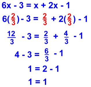 ![]() To check this equation, you can't use the decimal, as it is infinite in length. Rounding it will mean that the check won't work. You'll need to check the fractional answer. Here's that work: ![]() As in all checks, we didn't use algebraic solving, in case there was an error that we might repeat. We just substituted the answer and worked out both sides. It goes without saying that you need to be good at working with fractions. Go back and try the examples again if you need to, or return to the main Equations menu and practice a new type of equation. |