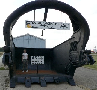 ![]() Occasionally they have to be moved across the highway, which requires the construction of an earth roadway so that the pavement isn't destroyed. These drag lines are powered by electric motors, so they also have a huge power cable. A 'walking drag line' is an excavator where the bucket is dragged by cables, rather than lifted by an arm. This allows the bucket to be much larger than those on shovels. Drag lines, because of their enormous size, can't move with wheels or bulldozer tracks; they move forwards using hydraulically operated 'feet', which raise and lower, one at a time. That's why they're called 'walking' drag lines. Below is a large photo of the mining operation at Bienfait, near Estevan. Notice the size of the other vehicles, even the earthmovers at the bottom of the pit, in comparison to the walking drag line. An old dragline bucket. Emily is standing inside; she's just over 5 feet 10 inches tall. This is one big bucket! Notice the teeth along the bottom edge; they're attached with bolts so that they can be replaced if they break or wear out. |