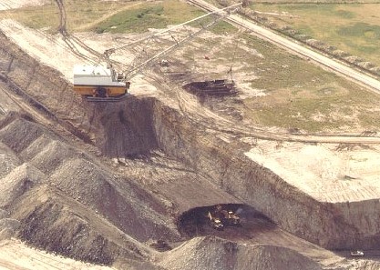 ![]() Large shovels are often used to mine coal, which lies in thin layers near the surface. The top layers of dirt (called the 'overburden') are temporarily removed, the coal is excavated, and then the dirt is put back. This process is called 'strip mining', because it is done in huge strips along the land. In this aerial view of the process, you can see a huge excavator at work. Although it looks like a shovel, this machine is actually called a 'walking drag line', because it moves by alternately lifting and lowering two gigantic 'feet', and the bucket is dragged by cables instead of being anchored on a steel arm. Here you can see the seam of coal being mined; it's a thin layer below and behind the excavator, on the left. Smaller equipment in the centre-foreground is used to remove the coal. |
