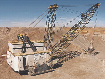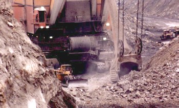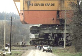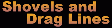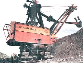 ![]() Here is a comparison, side by side, of a drag line and a shovel. Bucyrus-Erie is the American company which makes many of these machines. These pictures don't show the relative size of each; the shovel is actually much smaller. Drag lines can be a whole lot larger simply because the boom and arm of a shovel can't be supported if they get too large. The walking drag line on the left above is the Bucyrus model 2570WS, which has a bucket capacity of up to 120 cubic metres (160 cubic yards), and a boom length of 120 metres (400 feet). It can scoop up a single load weighing up to 360,000 kg, or 360 tonnes (400 tons). The machine itself weighs 7,200,000 kg (16,000,000 lbs). The shovel on the right has a 122,000 kg (122 tonne) bucket payload, only a third as big, but still respectable! Our research described many drag lines and large shovels built in the USA during the latter part of the 20th century, and the whereabouts of many of them are kept track of by people who are fascinated by these huge machines. Many of these pieces of equipment are given names, and people come from all across the country to watch it work and to take photographs; when an old one is no longer in use, support groups form to help raise money for its preservation. Specifications: Height: 67 m (220 ft) Boom Length: 61 m (200 ft) Bucket capacity: 79 cubic m (105 cubic yards) Bucket load: 145 tonne (160 tons) Machine weight: 6,400 tonnes (14,000,000 lbs) The Silver Spade, like all shovels, moves itself around on crawlers like a tank or bulldozer, except that the crawlers are much larger. The Spade has three double sets on each side, each one being 34 feet long and 8 feet high; individual pads on the tracks weigh about 2 tons each. Here are some photos of the Silver Spade in operation ... |