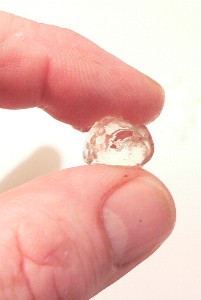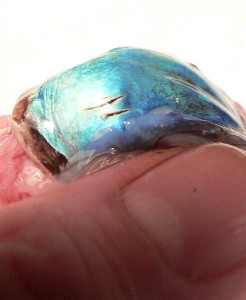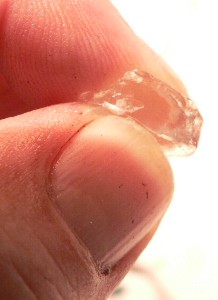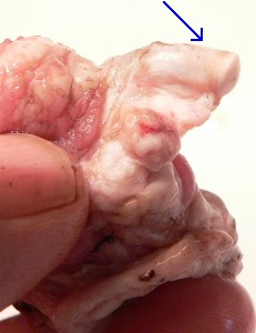The lens was in the front of the eye right behind the pupil. Its surface was not a flattened ovoid shape, but was fairly bumpy and irregular. In the third photo you can see it in cross-section after it was cut in half. Surprisingly, its texture was much like wax, in that it could be squeezed out of shape if pressure was applied.