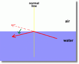 If the light hits the boundary at a large enough angle from the normal line, it will bend (refract) right back into the water! The light refracting downwards makes it look as if the light reflected off the boundary. This is called total internal reflection. Light does this when the angle at which it hits the boundary reaches the critical angle for that material.