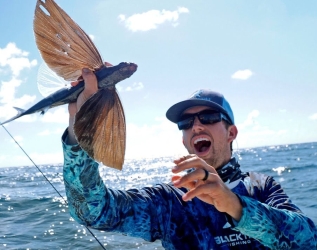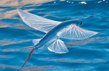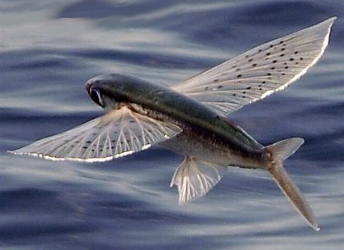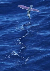 ![]() Exocoetidae ![]() While they cannot fly in the same way a bird does, flying fish can make powerful, self-propelled leaps out of the water where their long wing-like fins enable gliding for considerable distances above the water's surface. There are at least 40 known species of flying fish, which feed on a variety of foods, including plankton. Flying fish use their gliding ability to escape predators, including mackerel, tuna, swordfish, marlin, and other large fish. All flying fish have unevenly forked tails, with the lower lobe longer than the upper. Many species also have enlarged pelvic fins, and are known as 'four-winged flying fish'. ![]() It then goes airborne, reaching heights over 1.2 metres and gliding long distances, sometimes up to 200 metres. Once it falls to near the surface again, it can flap its tail and taxi without fully returning to the water. Capable of continuing its flight this way, flying fish have been recorded stretching out their flights with consecutive glides spanning distances up to 400 metres. In May 2008, a Japanese television crew filmed a flying fish off the coast of Japan that spent 45 seconds in flight. The previous record was 42 seconds. Spawning takes place in the open ocean, near the water’s surface. A female deposits eggs, which are attached by sticky filaments to seaweed and floating debris. Newly hatched flying fish have whiskers near their mouths, which disguises them as plants, protecting them from predators. A flying fish lives for an average of five years. Flying fish are commercially fished in Japan, Vietnam, and China by gillnetting, and in Indonesia and India by dipnetting. ![]() ![]() |
