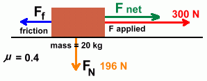 ![]() Page Two We need to review static and sliding friction, and Newton's First Law first. Newton described how an object at rest will stay at rest unless a force acts on it. This really means an unbalanced force. In other words, while you sit there in your chair, you are not moving. But there are two forces acting on you ... the force of gravity is pulling you downwards, and the chair is pushing back with the same force. The net result is zero, so there is no net force, and you don't move. Similarly, when an object is moving at constant velocity, there is no net force acting on it. But that doesn't mean there is no force ... just that the forces are equal and opposite. ![]() In the diagram above, the object is moving. But it is moving at a constant velocity. There is no acceleration. This is because there is no net force on it. There are two forces acting on the object, both the applied force and the frictional force, but they are equal and opposite, so they cancel each other out. In order to maintain the object's motion at a constant velocity, you must continue to pull with this applied force. The moment you pull less hard, or stop pulling, the frictional force will be stronger and the object will slow or stop. In order to maintain this constant velocity, you will have to pull hard enough to counteract the frictional force, which for a moving object is sliding friction. To get the object moving in the first place, you will have had to apply a slightly larger force, to overcome static friction (which is generally bigger than sliding friction), and to cause some acceleration. But once the object is moving at constant velocity, you only need to pull hard enough to balance the force of sliding friction. If you want to accelerate the object, however, your applied force must be bigger than the frictional force. Here's what happens when you apply a force to an object that is bigger than the frictional force. ![]() That's worth saying again, because it's important. When you apply a force to an object where there is friction, some of the force gets used to overcome the friction. Then, whatever is left can be used to accelerate the object. Let's stick with our 20 kg mass, which weighed 196 N, and look at what happens when we apply a force. ![]() Suppose we apply a force of 300 newtons to the object. The frictional force Ff can be found using: ![]() This means that the net force acting on the obect is only 300 - 78.4 = 221.6 N. Now we can find out its acceleration. Using F = m · a, where F is the net force: ![]() What we've just done is to calculate the acceleration on an object by applying a force, where there is friction. In order to do this, we needed to find the frictional force first, and subtract it from the applied force. The remaining net force was used to calculate the acceleration. This type of problem can also be done backwards, where you know the final acceleration, and are required to find out something about the forces. That's what we'll look at next ... go on to page three ... |