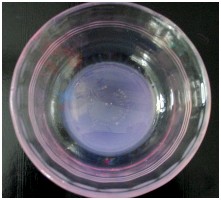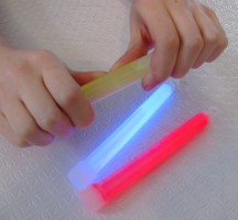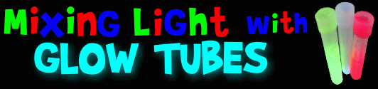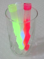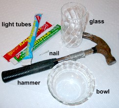 Crack all three tubes and allow a few minutes for them to get bright. Use the nail and hammer to punch two holes in the end of each tube. (A second hole allows the fluid to come out more easily). The glass is used to stand them up so they don't spill. Although the liquid inside the tubes is non-toxic, it will stain, so you'll need to be careful of your clothing. Also you don't want to get it in your eyes ... you should wear goggles. Now you're going to mix the colours together to produce white light. Different brands of light tubes probably have different colour strengths, so you'll have to experiment. We found the blue to be very weak, so we started with about 15 drops in the bowl. The liquid seems to evaporate quite quickly, especially as you slosh it around to mix it, so you'll need to move right along ... try adding 3 or 4 drops of green next. Finally, add a single drop of red and give the mixture a thorough stirring. We found that we obtained a mixture which glows with pure white light. You can see our result in the photo at the left. Although it seems a little blue in the picture, it was quite obviously white to the eye. We also wondered about the colour blue being so weak, while red is so strong. The glass at the right shows an equal mixture of all three colours, clearly dominated by red. We'd already noticed this phenomenon with blue Christmas lights on our house that were invisible from the road. Yet police lights are often blue! Find out why blue lights often seem so dim at a distance here. For Teachers: This method for demonstrating that white light can be made by combining other colours is simple and convincing, but it's quite expensive. The tubes came two to a package, for about $6.50, so the experiment cost us close to $20. However, the six tubes we purchased could quite easily have been sufficient for a class of 30 students working in groups of 2. The idea for this demonstration came from "See For Yourself ... More Than 100 Experiments for Science Fairs and Projects", by Vicki Cobb (Scholastic Reference), a highly recommended science idea book for grades 5 through 9. |
