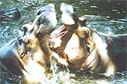 Males ram each other with their mouths open, using their huge heads like sledgehammers and their big mouths as buckets to throw water at each other. Adult males carry the scars of many such encounters, which are seldom fatal.