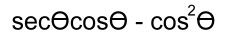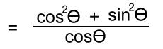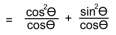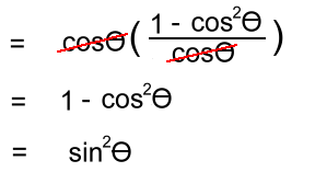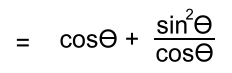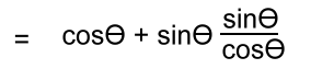 Simplifying Expressions Example 3: ![]() Start by changing everything to sin's and cos's: ![]() Multiply the last term: ![]() Now make the first term into a fraction, so we can add the terms: ![]() and add them ... ![]() Finally, use a Pythagorean identity, and simplify: ![]() Example 4: ![]() There are a number of things you could do here. Experience will tell you that when you can factor, you should do that: ![]() Now we can change everything to sin's and cos's: ![]() Combining the terms in the bracket will require they both be fractions: ![]() ![]() Finally, reduce and simplify: ![]() Next we'll prove some other identities. Move on to page four ... |