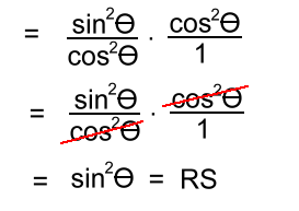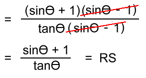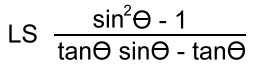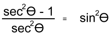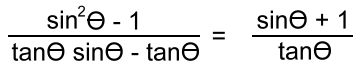 Verifying (Proving) Identities Example 5: Verify: ![]() 'Verify' means to show that it's true, algebraically. When possible, start with the more complicated side and try to reduce it to the other side. We'll start with the left side: ![]() The top is a Pythagorean identity: ![]() Change everything to sin's and cos's: ![]() Invert, multiply and simplify. The result is the same as the right side, which verifies the identity. ![]() Example 6: Verify: ![]() Start with the left side: ![]() Notice that the top factors as a difference of squares, as suggested by the top of the right side. The bottom has a common factor: ![]() Now simplify, and you're done! ![]() |