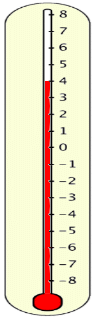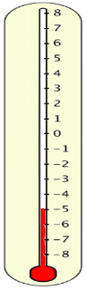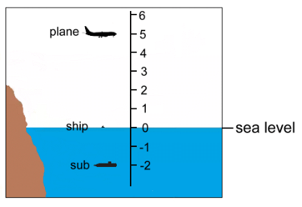 ![]() Page 2 Example 1: ![]() We can say that A is greater than B because 7 is greater than -2 or A > B because 7 > -2 We can also say that B is less than A because -2 is less than 7 or B < A because -2 < -7 Hete's another one. You try it: ![]() What can you say anout C and D? (two things): Use > and < signs ... Check your answers by holding the cursor over the box below: ![]() Example 2: ![]() 4 is greater than -1 E > F F is less than E -1 is less than 4 F < E You try this one: ![]() G H H G Answers: ![]() Example 3: ![]() The plane is at height 5 km. The submarine is at depth -2 km. How many kilometres above the sub is the plane? Answer: ![]() Example 4: ![]() It started by backing up at -7 km/h Its speed was -7 km/h Then it moved forward at a speed of 2 km/h. By how many km/h did the speed increase? Answer: ![]() Example 5: ![]() ![]() Here is a thermometer. In the evening on the left, the temperature is shown. At the right you can see the temperature the next morning. By how many degrees did the temperature fall? Answer: ![]() Example 6: Putting Integers in Order Rearrange the list of integers below by dragging them into order, smallest to largest. Then check your answer by holding the cursor over the blank box at the right.