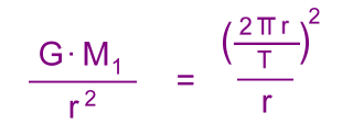 To determine the mass of a planet, it must have a satellite. Scientists need to know two things: how long it takes the satellite (a moon) to orbit the planet (called the period), and how far away the moon is from the centre of the planet. Both of these values have long been measureable; Galileo did it for the moons of Jupiter. Newton's Universal Law of Gravitation can be used to calculate the mass of any astronomical body that has a moon. However, Newton couldn't do it because the magnitude of the constant 'G' in the formula was not known at the time. The value of G was finally experimentally determined by Henry Cavendish in the 18th century to be the extemely small force of 6.67 x 10-11 Newtons between two objects weighing one kilogram each, and separated by one metre. It now became possible to find a formula to calculate a planet's mass! Here's how the formula is derived. Let's start with Newton's Universal Law of Gravitation: ![]() M1 is the mass of the planet m2 is the mass of the moon r is the distance between the planet and moon We'll also use the formula for centripetal force: ![]() v is the orbital velocity of the moon Finally, we'll need a formula for orbital velocity, based on the fact that the moon's speed, assuming a nearly circular orbit, is the total distance travelled in one orbit divided by the time to complete one orbit (the period). These are 2πr and T. ![]() We'll begin by recognizing that the gravitational force Fg holding the moon in orbit about the planet must be equal to the centripital force Fc: ![]() M1 is the mass of the planet m2 is the mass of the moon ![]() Divide both sides by m2 to eliminate it ![]() Substitute the orbital velocity formula for v Now we solve for M1, the mass of the planet: ![]() This leaves us with a formula for the mass M1 of a planet with a moon: ![]() r is the moon's radius of orbit G is the Gravitational Constant T is the period of the moon's orbit Notice a few things: - The similarity to Kepler's Second Law - The fact that we do not need to know the mass of the orbiting moon This is a powerful formula. It can be used, for example, to find such things as the mass of other stars with planetary systems, or the mass of a black hole that has a star orbiting it! Let's use the formula to calculate the mass of Jupiter. |