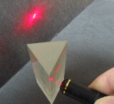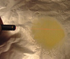 ![]() ![]() ![]() You'll need a clear bowl, some red and yellow Jello, and a red laser pointer. We made the red Jello first in the bottom of the bowl. When it was solid, we made a yellow batch on top of it. Red Jello absorbs all colours of light that pass through it except red, allowing this colour to pass through. We found that the yellow Jello also passes red light quite well ... that's why we used it too. The laser beam is easily visible in both types of Jello. ![]() We had expected the indices of refraction for red and yellow Jello to be nearly identical, and in fact they were. However, the index for yellow Jello is apparently very slightly less than that for the red, as we observed a slight bending of the light ray away from the projected path of the light, as you can see in the photo at the left. There is an even greater refraction that occurs when the light leaves the Jello to enter the air, but we weren't able to observe the beam in air ... more on that later! ![]() Because the indices of refraction for red and yellow Jello are so similar, we couldn't observe the critical angle for light passing from red to yellow Jello. We tried experimenting with other colours having red in them, but couldn't find another colour of Jello that would show the beam of red laser light. In order for light to be 'visible', it must hit something. As light passes through air, it does interact with the air molecules, but not enough to produce a visible path, as the air molecules are too far apart. In a solid like Jello, however, the light hits a lot of Jello molecules because they're packed together more densely, and some of the light that is not absorbed (in this case, red) will scatter and be visible to your eye. There are various methods you can use to make light beams visible in air, and most involve introducing small particles into the path of the beam for the light to scatter from. The simplest method is to use a misting spray bottle to place water droplets in the air. You'll be able to see the beam clearly. Unfortunately the beam won't show up in a photo. In order to demonstrate this method for seeing the beam in air, we experimented with other means, looking for ones which would photograph. We found that flour, shaken through a seive, and PAM spray (for coating pans before cooking) both produced a visible beam that would also show up in photos (see below). ![]() ![]() Although we didn't try it, you might combine a water mist with the Jello to be able to see the beam refracting as it passes from Jello into air. You might want to also experiment with mirrors, lenses, or prisms to make other reflection and refraction properties visible. ![]() ![]() |