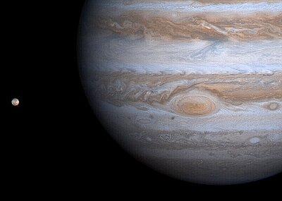 In this picture above, Jupiter's closest moon, Io, is visible. The white and reddish colors on Io's surface are due to the presence of different sulfurous materials, while the black areas are due to silicate rocks. Like the other Galilean satellites, Io always keeps the same side facing Jupiter. Io has more than 100 active volcanoes spewing lava at extemely high temperatures, and giant plumes of gas and dust rising up to 400 km high.