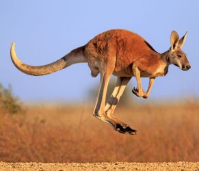They posess powerful hind legs, a long, strong tail, and small front legs. Thanks to their large feet, kangaroos can leap some 9 metres in a single bound, and travel more than 48 kilometers per hour. With an average life span in the wild of up to 23 years, and weighing on average 90 kilograms, kangaroos are herbivores that survive on grass and small shrubs. They use their strong tails for balance while jumping. Kangaroos are the tallest of all marsupials, standing at almost 2 metres tall.