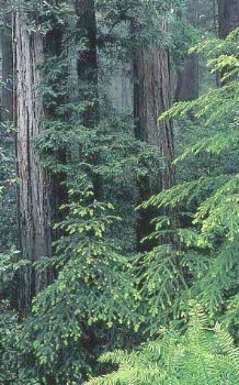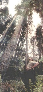 The Coast Redwood is a native of the west coast of the United States, a narrow 700-km-wide strip along the Pacific Ocean from central California to southern Oregon. Members of this species are the tallest trees in the world today, and also some of the oldest. Average mature trees which are several hundred years old usually stand from 60 to 75 metres tall (200 to 240 feet). Some Redwoods have been measured at more than 110 metres (360 feet). Coast Redwoods can live more than two thousand years, although the record is held by different tree. Redwoods are named for the colour of their wood. Like cedar, the high tannin content of the wood gives the trees resistance to fungus and insect infestations. Thick bark insulates them from periodic forest fires which destroy smaller trees. Redwood seedlings grow very rapidly, up to 30 cm (1 foot) per year, in good conditions. Temperatures where they grow are moderate all year, and heavy winter rains and dense summer fog provide the trees with the water they need. This climate was far more common in many continents in earlier eras; fossilized Redwoods have been discovered in many places around the world, some from as long ago as 160 million years. Coast redwood trees have two kinds of leaves. The top of the tree has small leaves, These are exposed to more wind and sunlight, and lose moisture rapidly ... that's why they're small. Leaves growing lower on the tree, however, are larger, flat, and tend to grow in clusters. Upper leaves shown on left; lower leaves on right. Also, a Eucalyptus regnans tree in Australia is believed to have measured 143 m (470 ft); another Australian eucalyptus almost certainly had been over 150 m (492 ft) tall. Neither of these trees is still standing. |