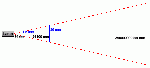 ![]() We were curious to see how much spread there would be using a simple laser pointer aimed at the moon. In order to figure it out an answer to this question, we first aimed the pointer at a wall across the gymnasium, a distance of 26.4 metres, or 26,400 mm. Next we set up this diagram: (The spread is exaggerated in order to make the diagram clearer) ![]() 390000000000 mm is the distance to the moon, in millimetres. We measured the width of the light beam coming out of the laser: - At a distance of 10 mm from the lens, and found it to be 1.5 mm (+/- 0.1 mm) across. - At the measured distance of 26400 mm (+/- 10 mm) across the gym, the width of the beam had grown to 36 mm (+/- 1 mm). In other words, the width of the beam had increased by a factor of 24 times (36 divided by 1.5) when the distance had grown by a factor of 2640 times (26,400 divided by 10). We now used a simple ratio problem to solve for the width of the beam at the moon, which is 390,000 km away. This distance is 3.9 x 1011 mm, or 3.9 x 1010 times as far as the first measurement 10 mm from the lens. ![]() This means that the laser pointer would cover a width of 525 km if shone on the moon. Allowing for the +/- error range on our measurements, and recalculating to get a lower and upper possible answer, we discovered that the solution could range between about 480 to 590 km. So a reasonable conclusion might be that a laser pointer beam will spread out to cover a width of somewhere around 500 km when it reaches the moon. We then did the calculation a different way to check the result. Using trigonometry, we found the half-angle of spread for the beam: ![]() Then we used this angle to calculate the width of the beam at the moon: ![]() Once again allowing for possible error in the measurements, we recalculated using the minimum and maximum possible values to determine that the width of the beam is somewhere between 517 and 546 km. This agrees well with our first result. It seems reasonable to conclude that a laser pointer beam will spread out to cover a width of somewhere around 500 km when it reaches the moon. If you compare this to the mere 1.6 km spread of a laboratory laser, it tells you that the light coming out of an inexpensive pointer laser isn't very coherent or monochromatic compared to a more expensive laser, although it still is a lot more so than an ordinary flashlight beam. Of course, the intensity of the laser pointer is also very small, so that the number of laser light photons impacting the moon would be so widely spaced out as to make the light undetectable. |