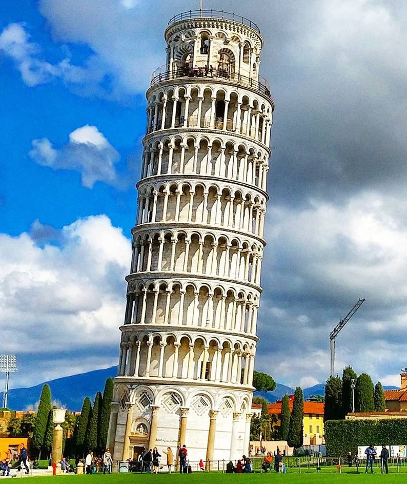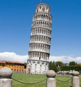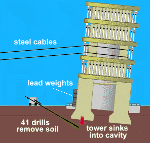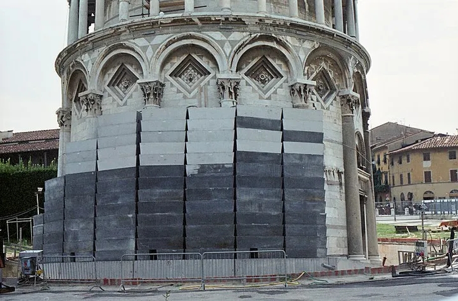 ![]() ![]() Begun in 1173, the tower was designed to stand 56 metres tall, and was constructed of white marble. Three of its eight stories had been completed when the uneven settling of the building's foundations in the soft ground became noticeable. At that time, war broke out between Italian city-states, and construction was halted for almost a century. This pause allowed the tower’s foundation to settle and likely prevented its early collapse. When construction resumed, builders tried to compensate for the lean by making the new stories slightly taller on the short side, but the extra masonry caused the structure to sink even further. ![]() Over the next four centuries the tower’s seven bells were installed; the largest weighed more than 3,600 kg. However, by the early 20th century, the heavier bells were silenced, as it was believed that their movement could potentially worsen the tower’s lean. The foundations have been strengthened by the injection of cement grout and various types of bracing and reinforcement, but in the late 20th century the structure was leaning 5.5 degrees (about 4.5 metres) from the perpendicular. It was still subsiding at the rate of 1.2 mm per year, and was in danger of collapse. In 1990 the tower was closed and all the bells silenced as engineers undertook a major straightening project. ![]() At this point the lead could be removed, and tourists allowed to re-enter. After the lead was removed, the angle continued to decrease. It’s now at about 4 degrees, and stable. ![]() ![]() Picture at left shows lead weights on north side |