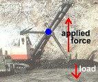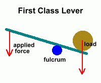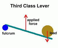 ![]() Page Two There are three types of levers, identified as first class, second class, and third class. The difference is where the fulcrum and applied force are, in relation to the load. Each class works differently, and is used to do different jobs. Let's look at the three types of levers in more detail. ![]() ![]() The diagram at the left shows a first class lever set up to move a heavy load with a small applied force. As explained on page 1, the force must be applied over a long distance, in order to make the heavy load move just a small amount. By adusting how far the fulcrum is from the load, you can control the mechanical advantage. The closer it is to the load, the more force is applied. The applied force is where your fingers are, pushing inwards on the handles. The load is at the blades where they meet, where a force must be overcome to cut through some material. It may look like the position of the fulcrum is not closer to the load, but it depends on where the blades meet. Cutting something close to the fulcrum puts the load closer, so you get mechanical advantage and multiplied force; you can easily cut through thick material. If the blades are doing the cutting at their tips, you don't get this advantage. ![]() ![]() This lever is different in how it works ... it causes the load to move in the same direction as the force you apply. Just as with a first class lever, how close the load is to the fulcrum determines by how much your force will be multiplied. If you want to move a very large load with a small applied force, you must put the load very close to the fulcrum. We know these are second class levers because the fulcrum is at one end, and the applied force is at the other. The load is in between. You get more mechanical advantage if you place the nut closer to the fulcrum than to your hand. The closer it is, the more your force gets multiplied. That's why it can still be difficult to crack a very large walnut ... you can't get it as close to the fulcrum as you can a small nut, so you have to apply more force ... the force isn't getting multiplied as much. ![]() ![]() The fulcrum is once again at one end of the lever, but this time the load is at the other end, and you apply a force in between. This lever can not give any mechanical advantage. Regardless of where you apply the force, the force you apply must always be greater than the force of a load. If you were using this lever to lift an object at a distance, it would require less force to just stand above it and lift it up ... using the lever will require more force! So why use a third class lever at all? The answer lies in the fact that the load moves in the same direction as the force you apply, which is convenient. So is the application of force between the load and the fulcrum. ![]() It pulls, under the skin, with a force applied to your lower arm where the muscle is attached to the bone (the pink arrow), but only a portion of that force (the red arrow) can be used to move the load. ![]() ![]() The arm on a power shovel is a third class lever, with the fulcrum on the main boom, at the left end of the lever arm. The force is applied by the cables, somewhere along the arm. The load is at the far right end of the arm ... the scoop. As with all third class levers, the applied force must be larger than the load. But a motor takes care of that. This type of lever lets you lift things at a distance by pulling up. Now that you know all about levers, you might want to try a quiz to see if you can recognize which type of lever is which. If you want to try the quiz, go on to page three. |